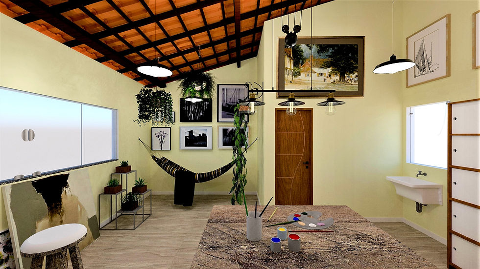 A cliente nos procurou com a ideia de criar um novo espaço para pintar e expor seus quadros juntamente com seu acervo de livros, como o ambiente terá bastante cores devidos as suas artes optamos por uma cor neutra nas paredes e reutilizamos móveis que ela já tinha, como as estantes e a mesa. Pensando em uma área para descanso colocamos uma rede.